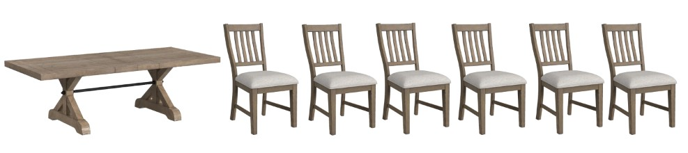 Gather in rustic elegance with the charming Yellowstone 7-Piece Dining Set. Crafted with a warm, textured finish, each piece tells a story of timeless craftsmanship. The sturdy trestle-based table combined with 6 matching side chairs, invites family and friends to enjoy meals in a stylish setting.Read More