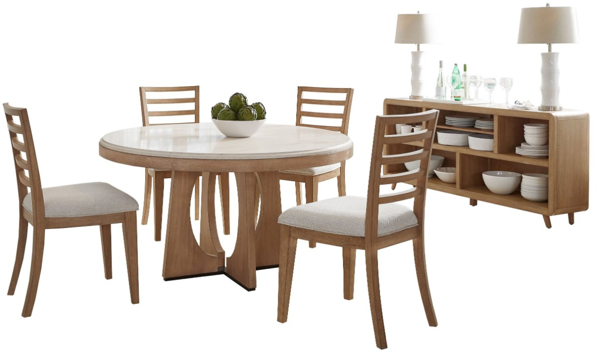 Set includes stone top 54" round dining table, four (4) coordinating ladderback chairs and one (1) console