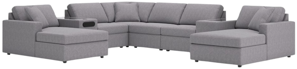 Includes 8 Modular Pieces: Left-arm facing corner chaise, audio console with storage, console with storage, 3 armless chairs, wedge and right-arm facing corner chaise